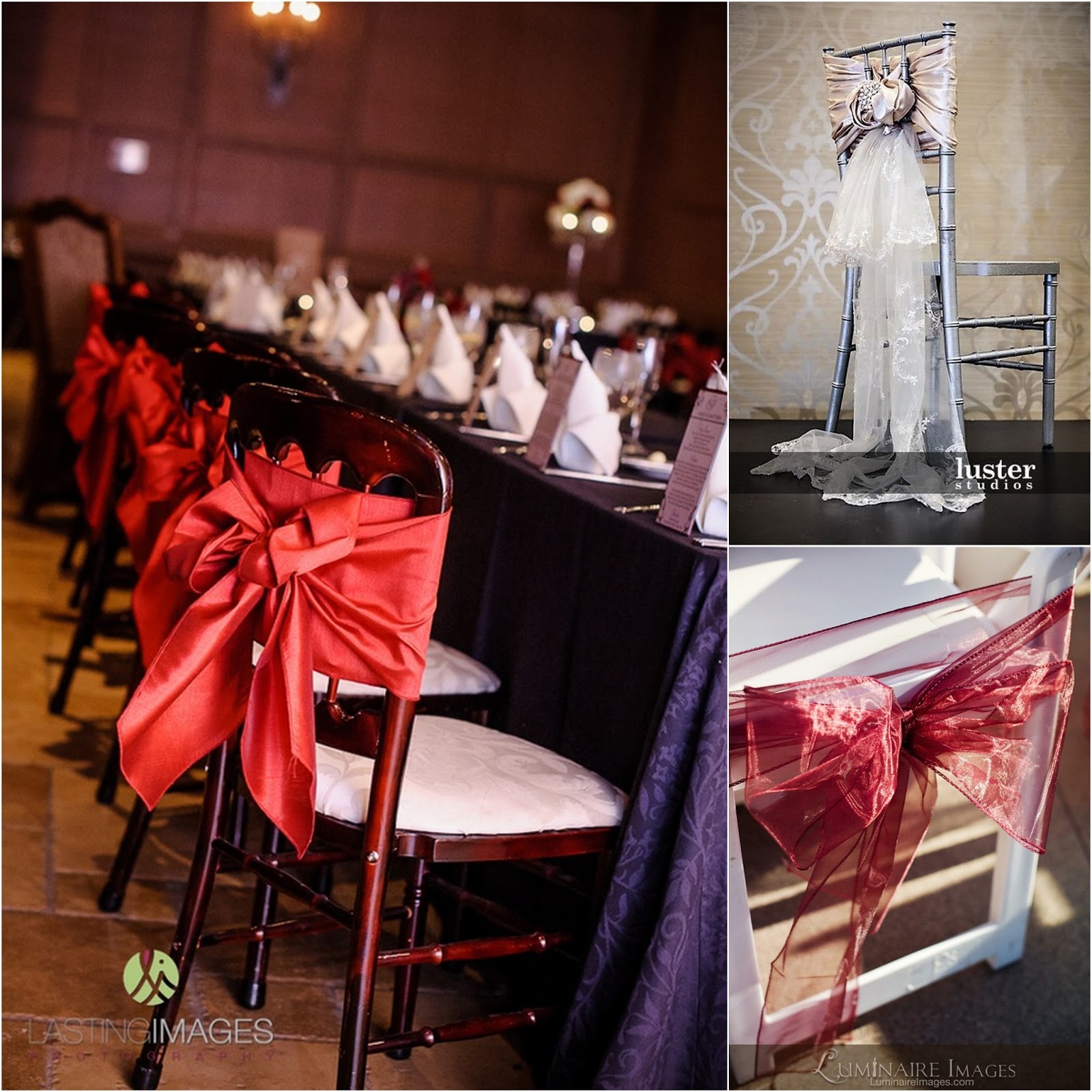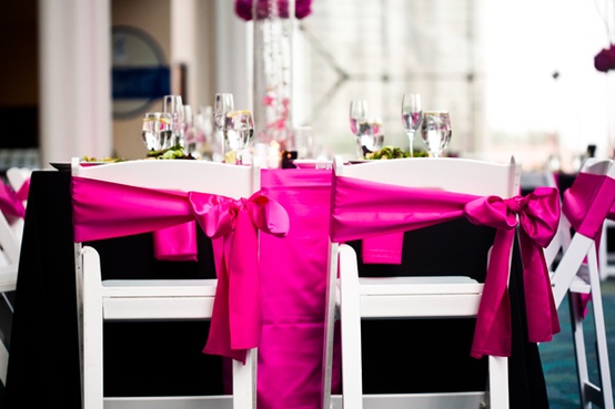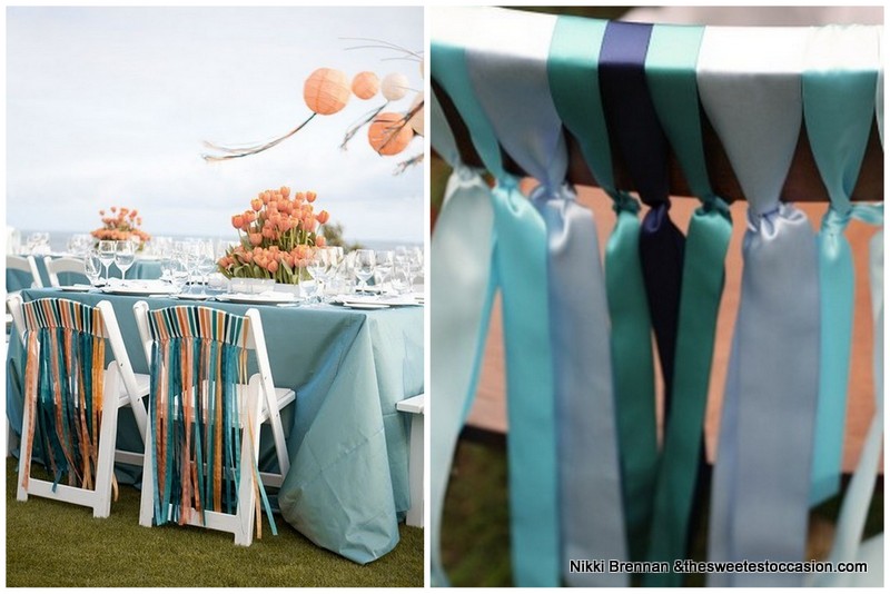 To kompromis pomiędzy wstążkami a kokardami, znakomite rozwiązanie dla tych z Was, które nie są pewne, które z dwóch pierwszych rozwiązań bardziej im odpowiada. Przewieszone przez krzesła jednokolorowe szarfy prezentują się świetnie, a co najważniejsze – także dają pole do popisu i stwarzają nieograniczone możliwości dekoracyjne: