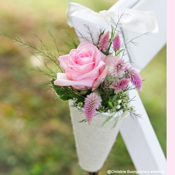 Szalony pomysł? Niekoniecznie! Niewielkie doniczki z kwiatami zawieszone na oparciu, to wyjątkowo czarujący sposób na przystrojenie krzeseł na sali weselnej:
