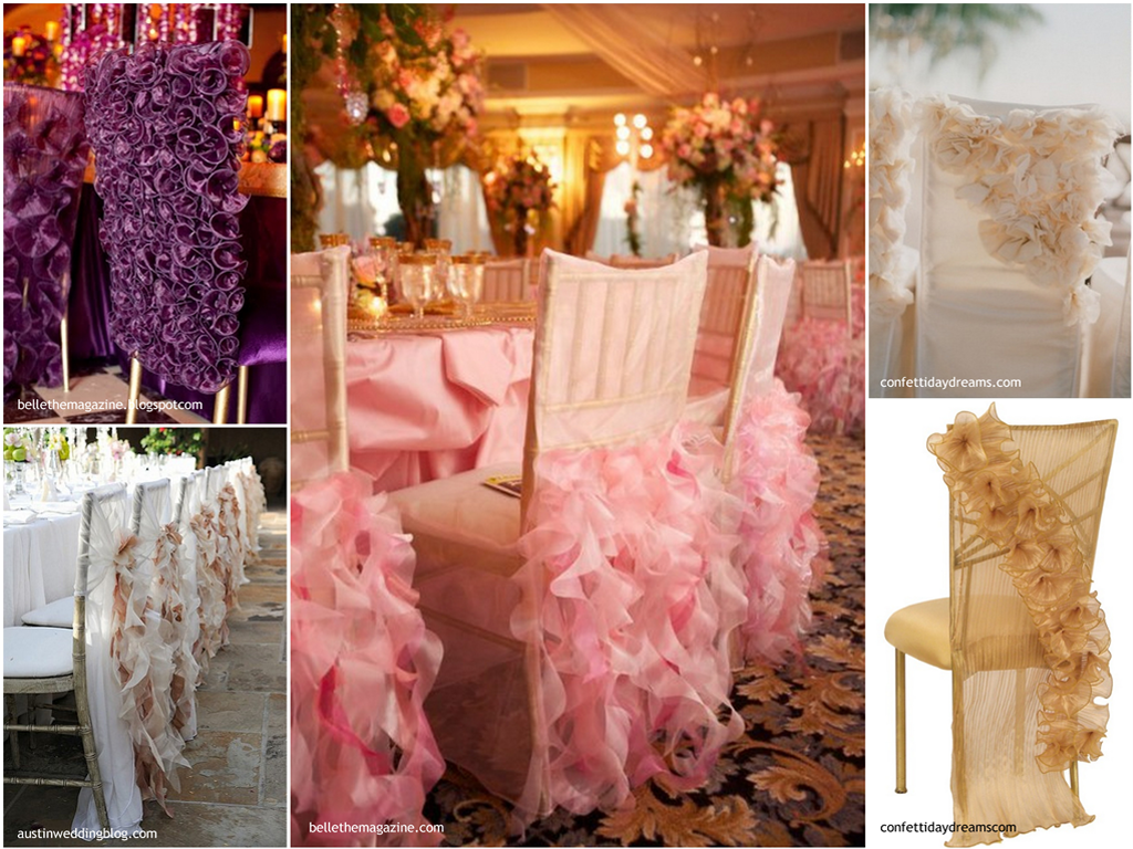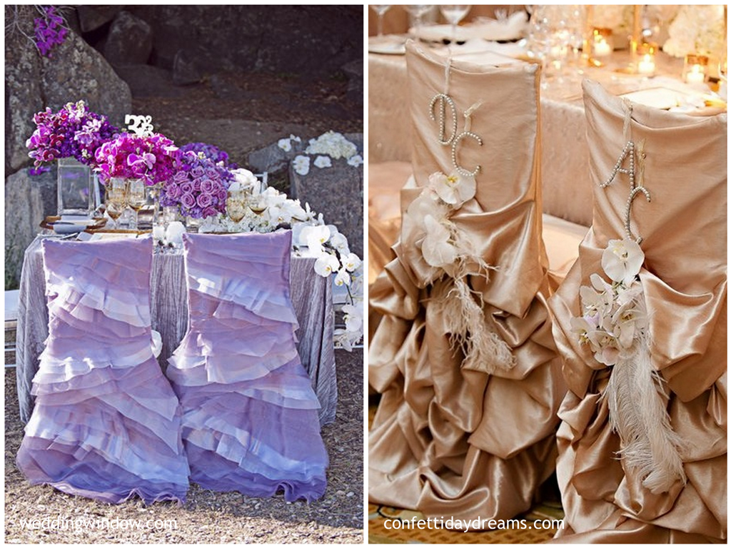 Nasunięte na oparcie krzesła ozdoby z materiału, pozwalają na osiągnięcie oszałamiających efektów:
