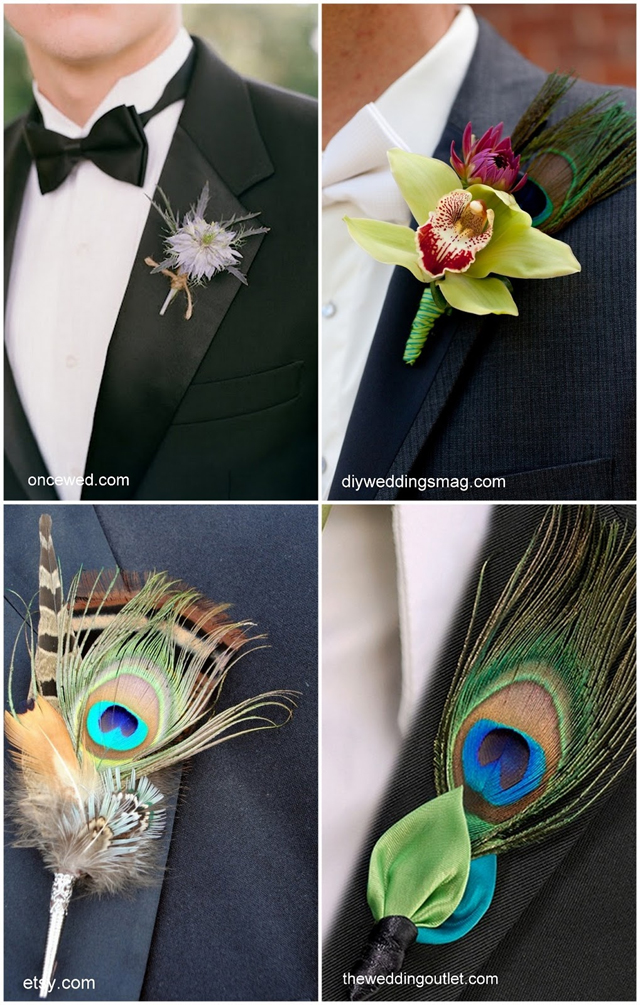 Jeśli motywem w bukiecie Panny Młodej są pióra (np. pawie), również w butonierce powinien pojawić się taki akcent: