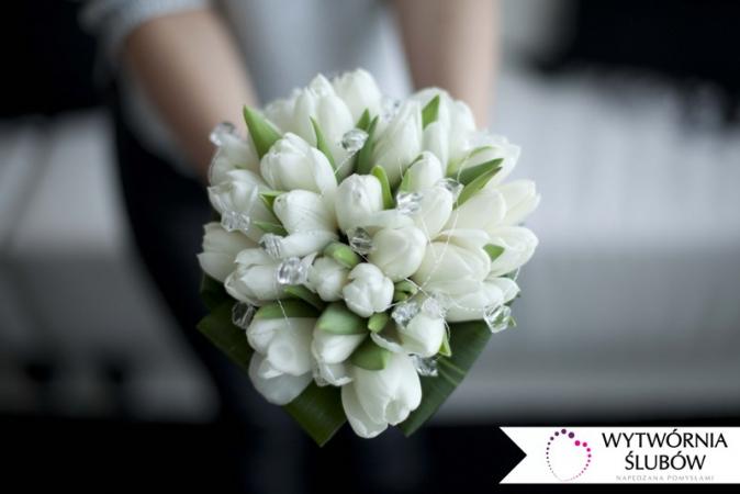 Proste, eleganckie rozwiązanie to tulipany połączone z kryształkami na drucikach, na taki bukiet ślubny zdecydowała się jedna z naszych tegorocznych „zimowych” panien młodych: